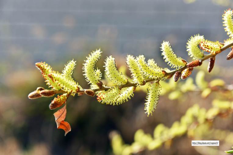 천 수변에는 버들강지와 노오란 산수유나무