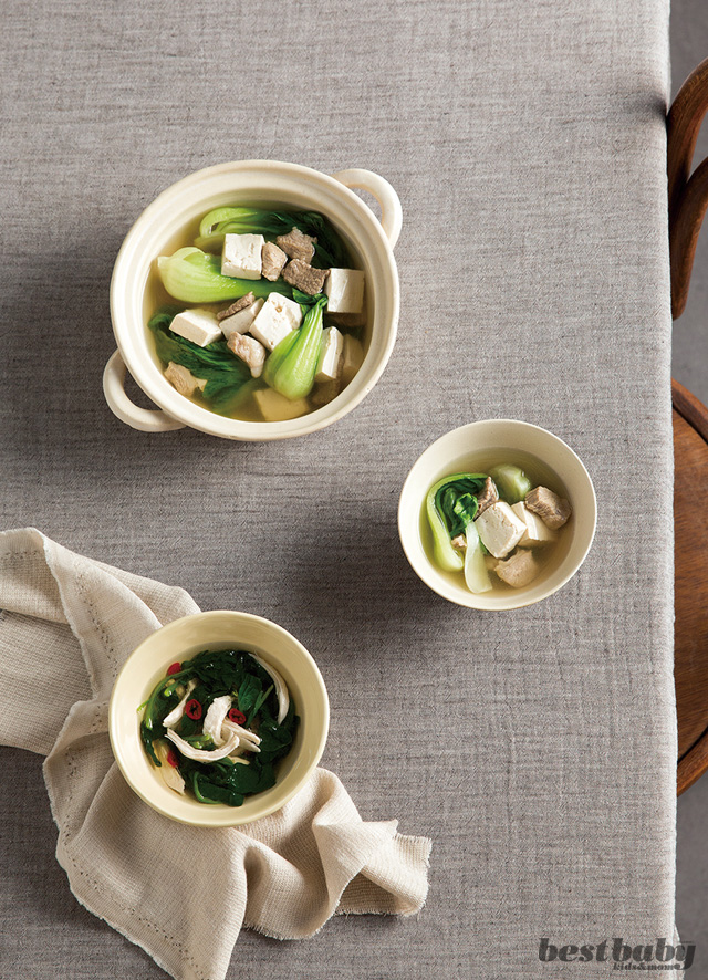 재료 소고기(국거리용) 150g, 두무 ½모, 청경채 5포기, 대파 ½대, 국간장 1½큰술, 청주 1큰술, 다진 마늘 2작은술, 물 7컵, 참기름·소금 약간씩