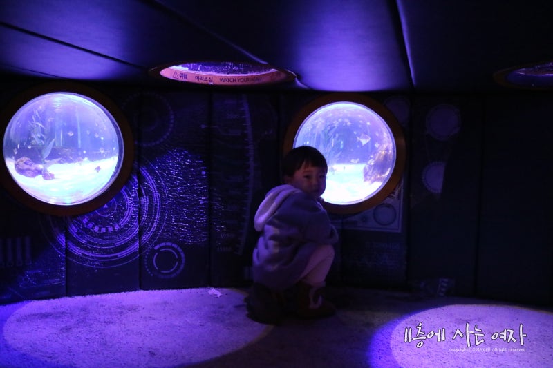 깊은 바닷속이니 만큼 내부도 더 어두컴컴하고 야광불빛이 많이 보인다. 그래서일까 쪼선생이 무서워하기 시작했다 ㅠㅠ