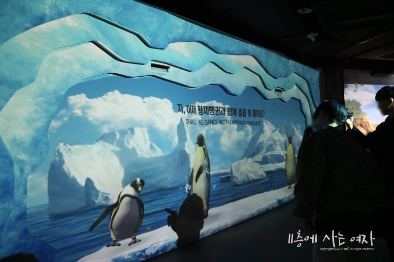 바닥에 포인트가 그려져 있는데 거기에 서서 움직이면 화면에 펭귄이 나타나서 내가 하는 행동을 똑같이 따라해준다.