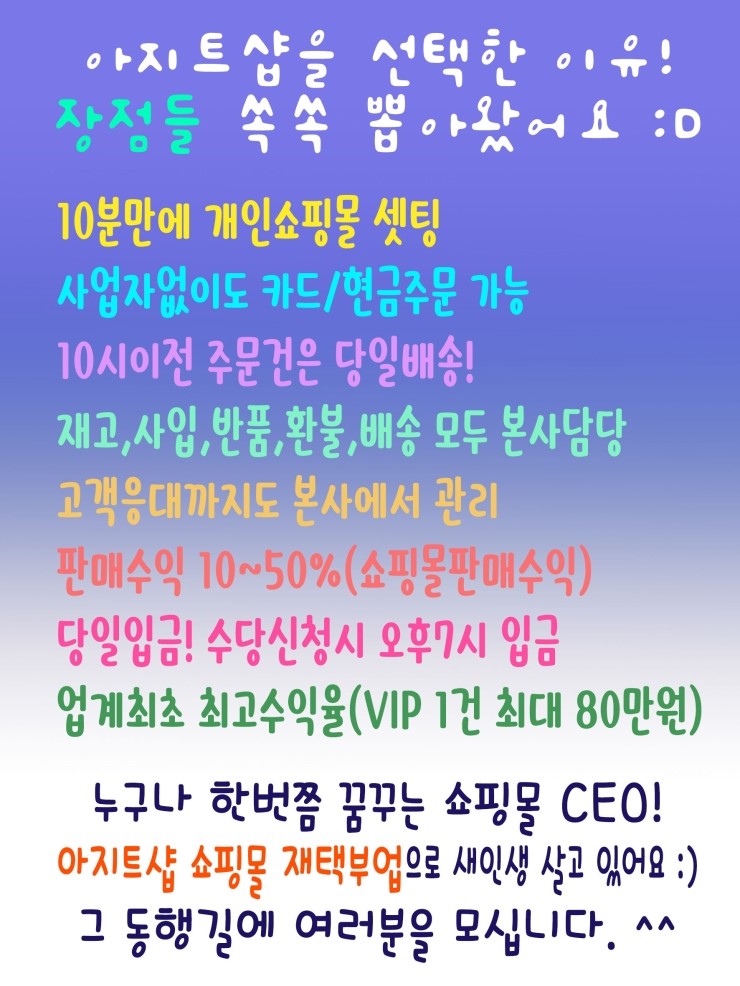 여러분들도 저와 함께 같이 쇼핑몰을 운영을 하면서 즐겁게 일을 해보세요!!